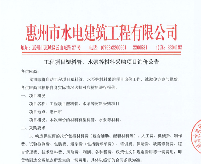 惠州市水電建筑工程有限公司成立于一九六四年四月,隸屬惠州市水務集團有限公司,是一家國有綜合性施工企業(yè),主營水利水電工程、房屋建筑、市政工程等施工業(yè)務。公司擁有水利水電工程施工總承包一級、建筑工程施工總承包一級、市政公用工程施工總承包一級、公路工程施工總承包三級,公路路基、路面及建筑裝修裝飾專業(yè)承包二級,環(huán)保工程、機電安裝、河湖整治、輸變電工程專業(yè)承包三級等經(jīng)營資質(zhì)……